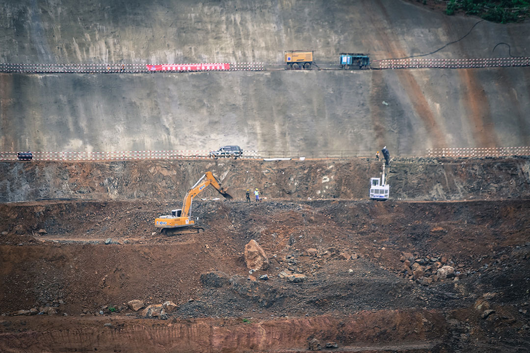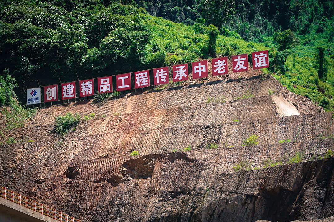 Hours later we round a corner and see the signs of construction, open-cut hillside bare to the bedrock, trucks and excavators, and jungle streams flowing into the river via concrete drains.