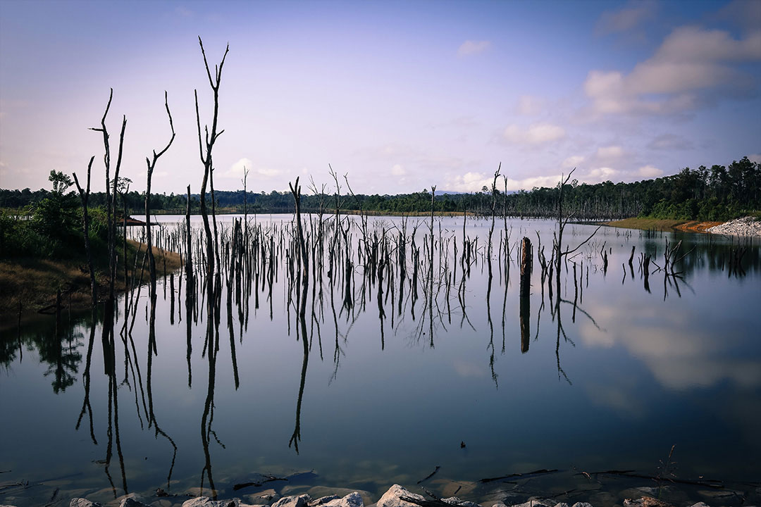 Arriving on a newly surfaced road we snake past valleys filled with drowned forests. Passing through a makeshift checkpoint where villagers check for smuggled wildlife and precious wood, we arrive in a well-ordered town on the shores of a manmade lake.