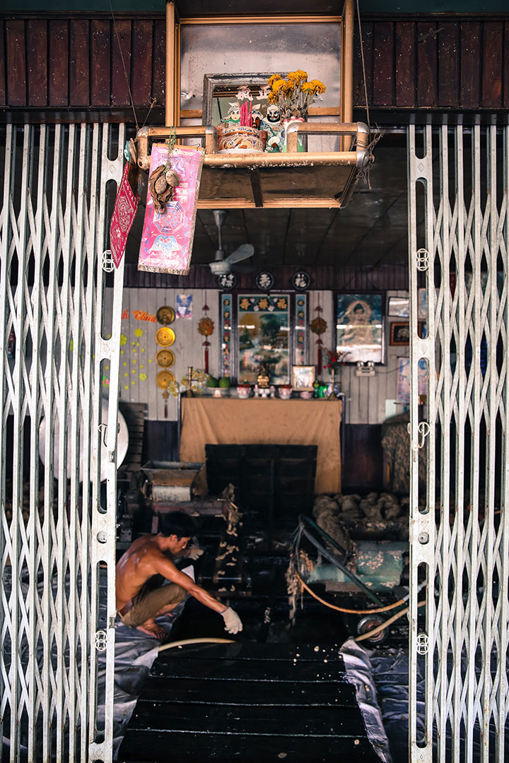 Approaching the northern Delta on the Hau River, I visit a Cham village that lies behind a curtain of mangroves and Nipa palms. Children play on a long rickety jetty, leaping into the river as a warm rain sets in. The Cham people are a Muslim minority and one of the oldest communities to settle in this area. Their homes are set on high stilts, and the ground is slippery clay. This is a town designed to ride out the annual flood season.