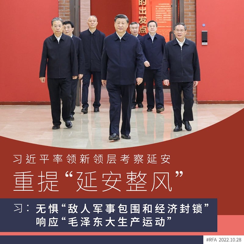 根据中国官媒新华社报道,二十大结束后不到一周,习近平带领中共中央政治局常委李强、赵乐际、王沪宁、蔡奇、丁薛祥、李希考察延安。报道指,这宣示“新一届中央领导集体赓续红色血脉、传承奋斗精神。”